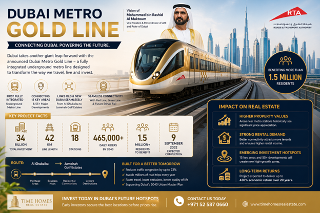 For investors, this is where real value begins. Metro projects in Dubai have always driven property demand, and the Gold Line is expected to do even more. Areas close to metro stations often see rising prices, strong rental demand, and faster returns.