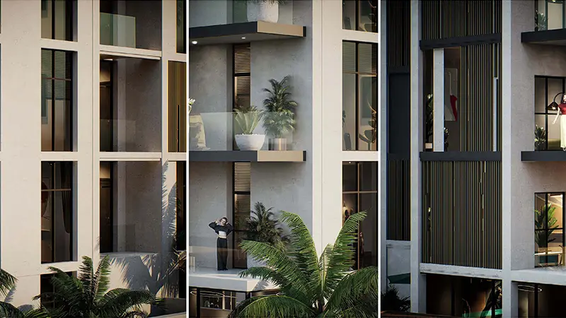Large windows are placed to allow natural light into living areas. Many units include balconies that extend the usable space outdoors. Additionally, the entrance leads to a welcoming lobby designed with clear circulation and simple detailing.