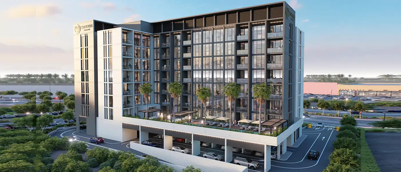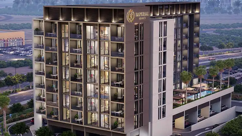 Imperial Residence is an impressive residential building. Its design uses clean, contemporary lines. Large windows allow natural light. There are balconies that stretch views across Dubai Production City. Interiors are modern and functional whereas smart layouts maximize space. The exterior features landscaping, walking paths, gardens, and water features. Balance between built form and nature is a theme.