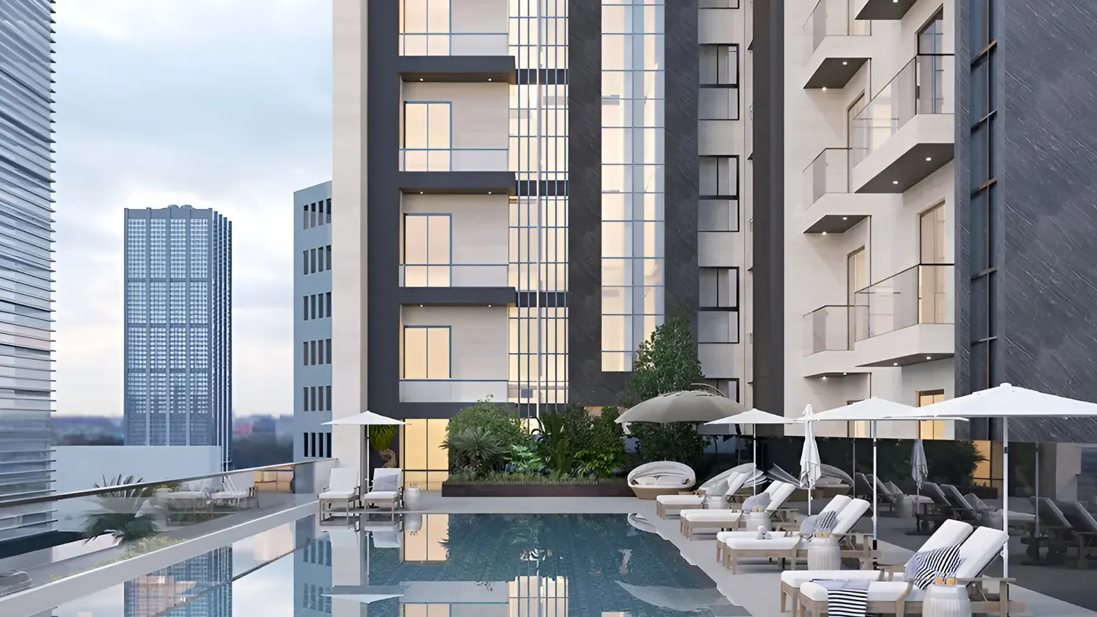 The structure maintains a subtle and neat appearance , settling well on the skyline of JVC. The front is light-coloured in colour, glass balconies and proportional balance. The layouts within the apartments are open and well-ventilated.