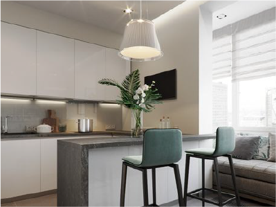 Apartments feature a three-layer glass system for clear views and noise reduction. Interiors are designed for durability and style. Floors have porcelain tiles with a marble look. The walls are smooth with emulsion paint while kitchens and bathrooms include premium German appliances and fixtures from Siemens and Bosch.