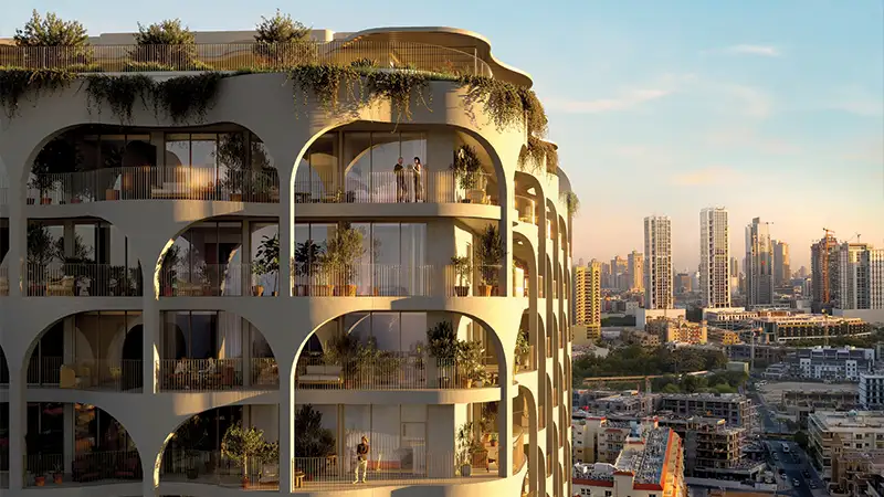 The building uses a woven facade motif that gives it a distinct look in JVC. Balconies interlink and curve to create private outdoor pockets. The structure includes podium levels and several residential floors. Finishes aim to be modern and durable. Kitchens come fitted and bathrooms are planned for efficient use. Materials focus on low maintenance and neutral palettes for easy furnishing. The overall design keeps sight lines and privacy in mind.